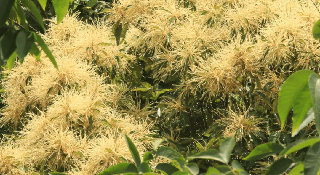 黧蒴锥树的枝叶十分茂密,狭长的黧蒴锥树叶两侧呈锯齿状,叶面的纹路清晰可见,颇有质感。在茂盛的枝叶顶端,长满了一簇簇淡黄色的黧蒴锥花。仔细端详,黧蒴锥花的花朵并不张扬,毛茸茸的花朵虽十分细小,但甚是可爱,只见它们密密匝匝地排列在纤细的花枝上,以其独特的魅力,散发出一种内敛的美。