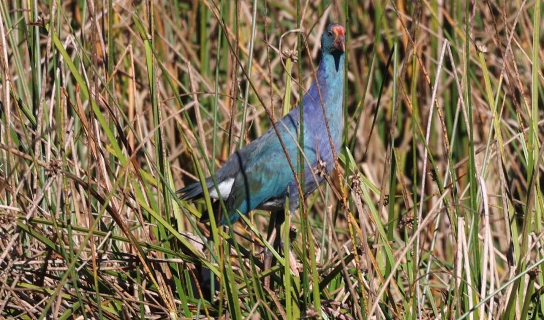 阳光照耀下,雾气逐步散去后,碧空如洗。微风拂过,枯荷如同风铃般沙沙作响。白胸翡翠有的站立于枝头机警地观察着水面,有的站立于电线杆上随时准备一跃而下。紫水鸡在蒲草丛中惬意地晒着太阳,羽毛在阳光下闪耀着金属般的质感,如同孔雀的羽毛般美轮美奂,故而有“最美丽的水鸟”“水中凤凰”等美称。