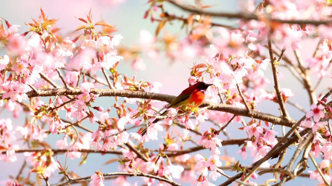 在冬樱林中,鸟儿欢歌笑语,穿梭于花枝间,只见它们时而停歇于枝头婉转啼鸣,时而振翅高飞于云雾之中。它们的歌声清脆悦耳、婉转悠扬,似银铃般在这片静谧的天地间回荡,为这如梦的世界增添了一抹灵动活泼的亮色。鸟儿的啼鸣与冬樱花的婀娜舞姿相互交织缠绕,共同奏响了一曲天籁般的自然和谐乐章。于这空灵澄澈的乐章中,仿佛能聆听岁月的浅吟低唱,触摸大自然的细腻脉搏,感受生命的蓬勃力量与温柔情怀。