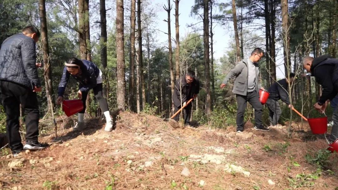 植树现场,大家团结协作,三人一队、五人一组,打塘、运苗、扶苗、铲土、浇水,到处都是忙碌的身影,每道工序都一丝不苟,不一会儿,一棵棵玉兰花树和樱花树便在善洲林场安了新家。