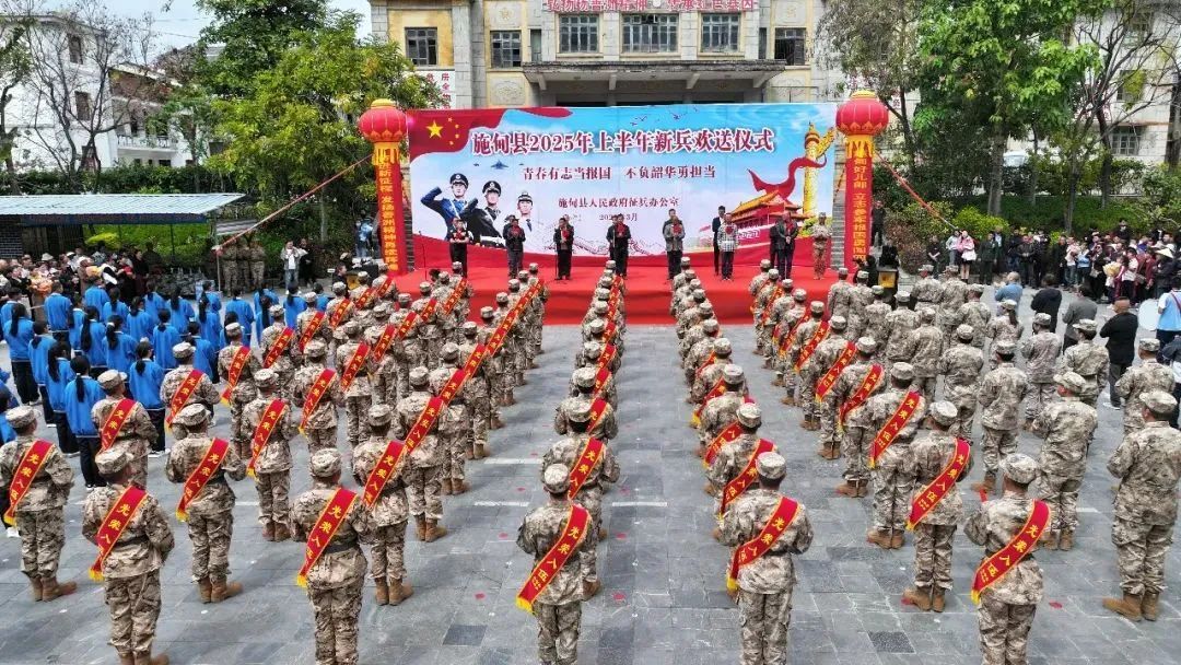 3月14日,施甸县2025年上半年新兵入伍欢送仪式在电影院广场举行,热烈欢送即将奔赴军营的新兵们。