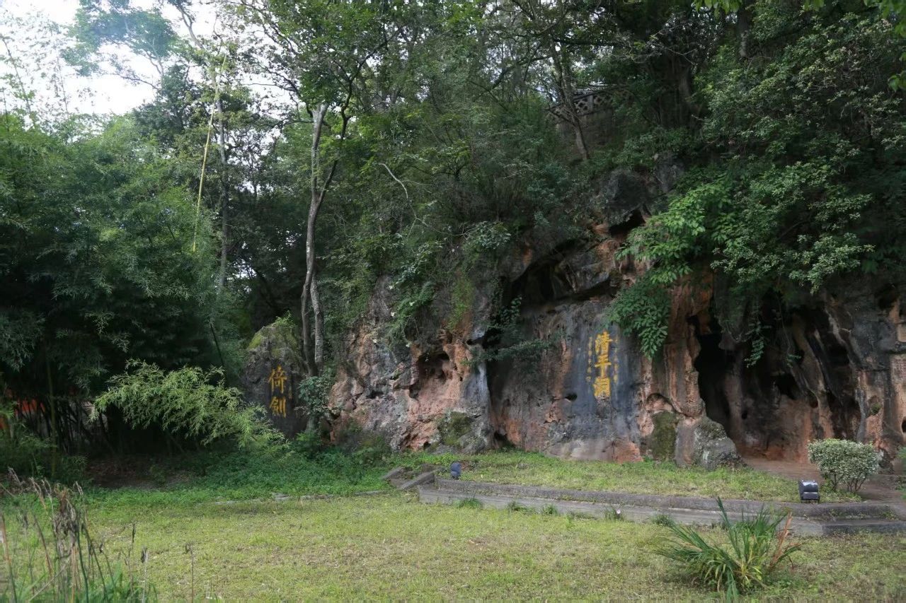 入口左侧可见翠竹青青、石碑耸立,该石碑乃属“恤忠祠记碑”的摘抄本。原保山地委书记杨善洲于1979年筹集资金,重修清平洞“三亭一碑”。将原碑锁于左上角碑亭保护起来,而后复刻一块并以竹相伴,铭记英雄史迹,供后人解读凭悼。洞口“清平洞”属邓子龙亲笔手迹,三字大气磅礴,如山脊水路一般沟壑纵横,这是清平洞的正门,也是邓子龙的大本营,左方有三米多高的石头“倚剑”在旁,这是邓子龙封的卫士,以“石敢当”的气势守护“清平”。