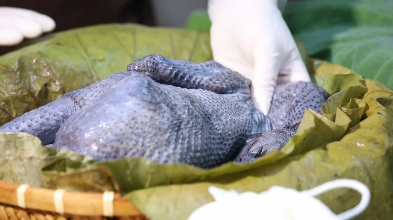 选取精心饲养12个月以上的乌鸡,细致处理干净后,便迎来这天然的华服——浸润着湖水气息的荷叶,整只鸡被荷叶层层裹紧再用麻绳捆扎后送入蒸屉,神奇的变化在氤氲水汽中悄然发生,荷叶的清香与鸡肉的醇厚油脂在高温下缱绻交融,清香丝丝沁入肌理。待高温蒸制两个小时后,剥开层层荷叶,热汽裹挟着无法抗拒的复合香气轰然升腾。鸡肉泛着黝黑温润的油光,淋上秘制的料汁,轻咬一口,丰沛汁水瞬间唤醒味蕾,荷叶的清新完美化解油腻,只留满口鲜爽,直让人感叹这方水土的慷慨。