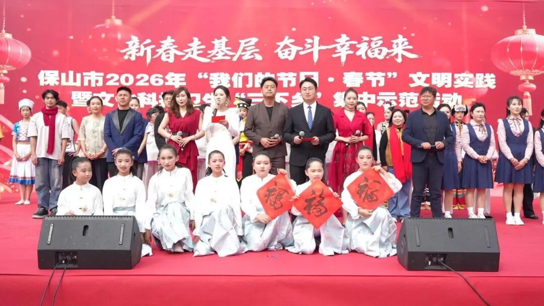 临近春节,保山市2026年“我们的节日·春节”文明实践暨文化科技卫生“三下乡”集中示范活动在施甸县姚关镇火热举行。一场集文明实践、文艺表演、便民服务、知识普及、年货展销于一体的“新春服务大餐”,让善洲故里的群众在欢声笑语中提前感受到了浓浓年味。