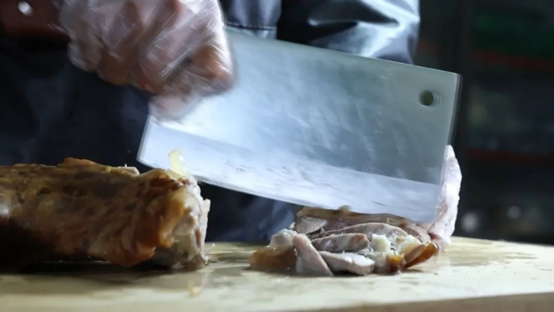 羊扒烀美味,做法却也简单。将新鲜健壮的漫山跑的羊宰杀后放入大铁锅,倒入清水,放入调料,炖上二至三小时便可。而羊汤锅的火候,对其最后呈现的味道至关重要。出锅后,铁锅里汤鲜肉美,令人垂涎欲滴。说起羊扒烀,要数头锅最鲜美。炖煮好后,把大块羊肉捞出经过大厨们“庖丁解羊”式的熟练刀法,各个部位被分割成小块,放入锅中加入煮羊的原汤。青花椒丢上几颗,羊肉汤的灵魂被激发出来。