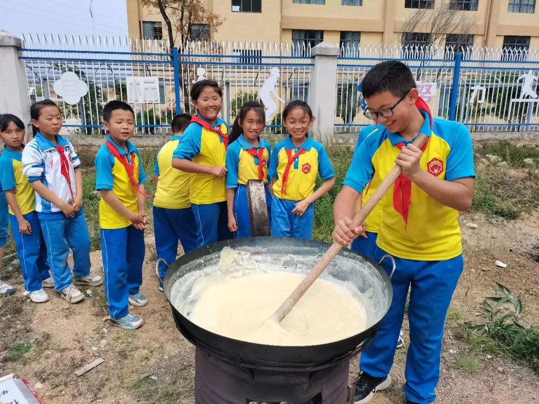 在老师和家长的指导下,学生忙得不亦乐乎,将过滤好的豌豆浆倒入锅中烹煮,不断地搅动,直到豆粉可以连成线,这个时候就到了出锅的最佳时机。