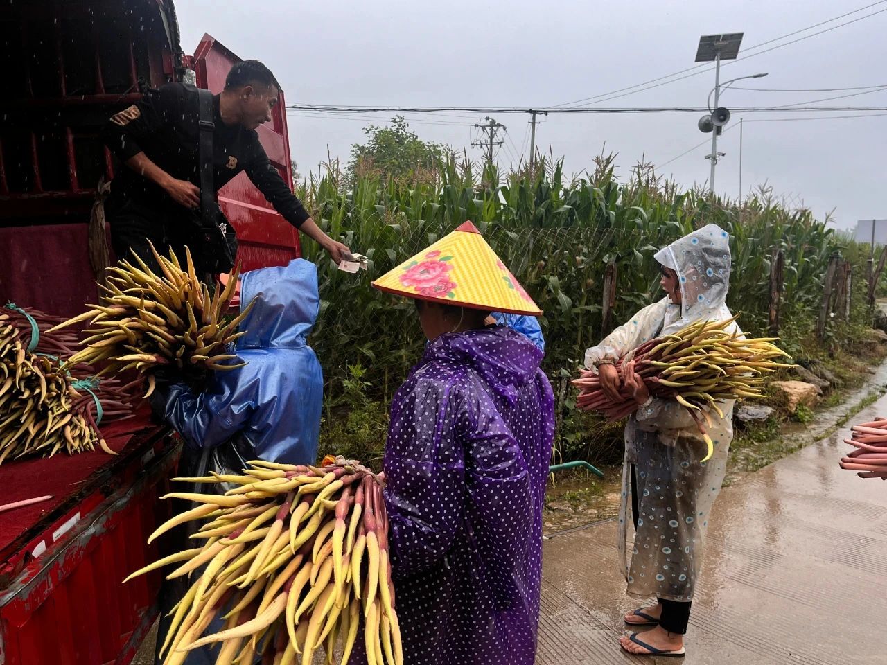 到了下午,收购商来到村里的收购点,种植户拿着捆扎好的芋花经过排队、过秤、结算,陆续拿到了自己的丰收“果实”。