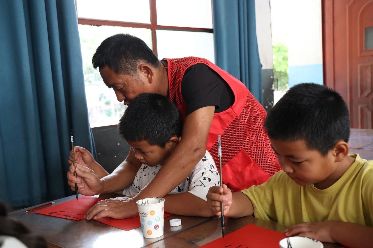 每日作业辅导环节,大学生志愿者耐心答疑,使知识巩固在轻松氛围中悄然完成。活动尾声,“五老”队伍中的两位退休教师提笔示范,教孩子们感受毛笔书法的汉字之美。7月20日的成果展示课上,手工水鼓、红色画作、书法习作组成了一份沉甸甸的“文化答卷”,孩子们自信分享、踊跃展示,笑声与掌声中满是收获的喜悦。优秀学员接过大学生志愿者手绘的证书与纪念品,每一份鼓励都承载着青春与文化的温度。