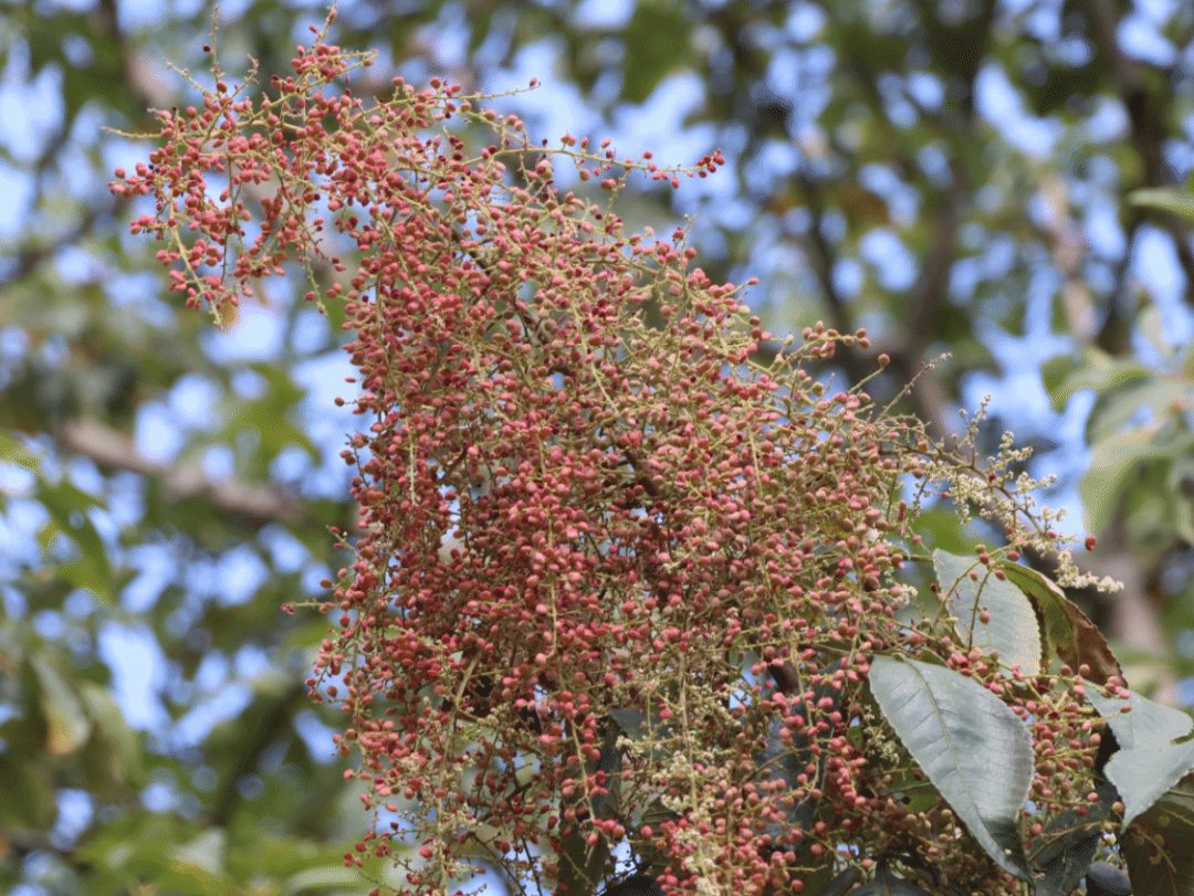 木老元的秋日阳光依旧带着几分炽烈,这份“热意”催得盐霜果的花期提前落幕,米粒般小巧的青果便悄悄缀满了枝头,密密麻麻,透着青涩的生机。在连日炽烈阳光的浸润下,青果渐渐褪去青涩,染上深浅不一的赭红色,个头也悄悄膨大,饱满的果实一串串垂落,将纤细的枝条压得微微低垂。凑近细看,每一颗都圆润饱满,表面裹着一层细密的白霜,宛如缩小版的山楂雪球,白里透红,格外诱人。