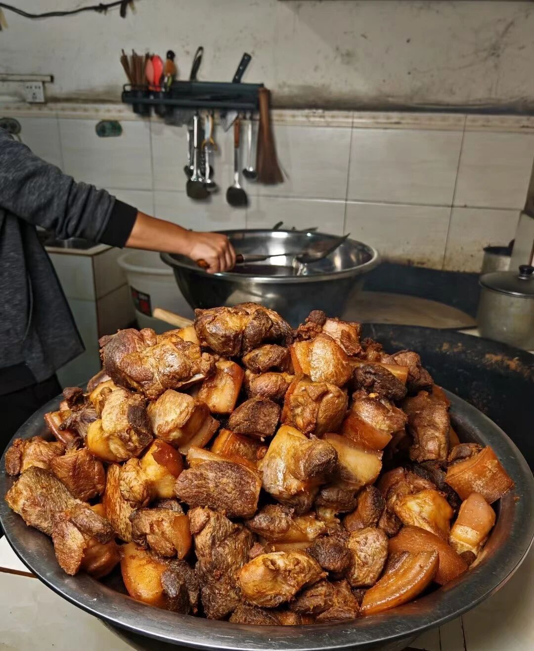 制作过程非常考验手艺。老师傅们传承古法,肉块先焯水定型,接着入锅炸至金黄。这一过程既能逼出多余油脂,又能形成酥壳防止腐坏。李大爷守在锅边,专注地看着,一守就是好几个钟头,仿佛在完成一项神圣使命。他说:“急不得,快了肉不香,慢了肉会老。”
