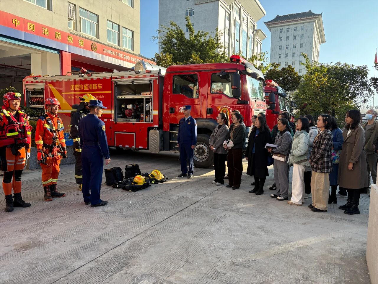 活动伊始,参训人员在消防宣传员引导下,依次走进营区车辆装备展示区、营房区域、战备器材库,近距离观摩各类消防车辆与专业救援装备。消防员详细讲解装备性能特点、实战应用场景及操作要点,让大家直观感受消防救援工作的专业性与艰巨性。在科普教育基地,通过实物展示、互动体验等形式,系统学习消防安全核心知识与常用器材使用方法;在荣誉室,一幅幅奋斗图景、一座座荣誉奖杯,生动展现了消防队伍的使命担当与过硬作风,让在场人员深受触动。