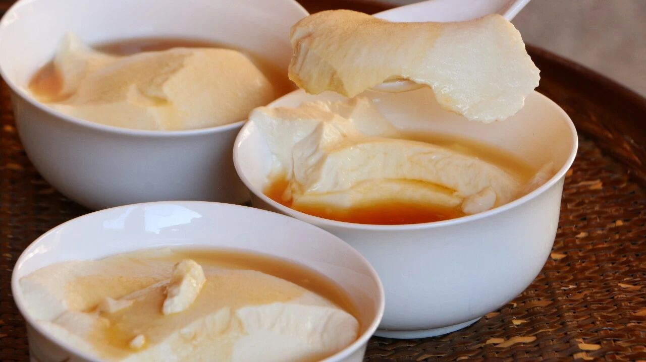 接着,将豆浆倒进锅中煮熟,再放入事先准备好的石膏水,静置二十分钟左右,一锅洁白凝脂悄然成形,颤巍巍、嫩滑滑,吹弹可破的豆腐花就制作完成了。
