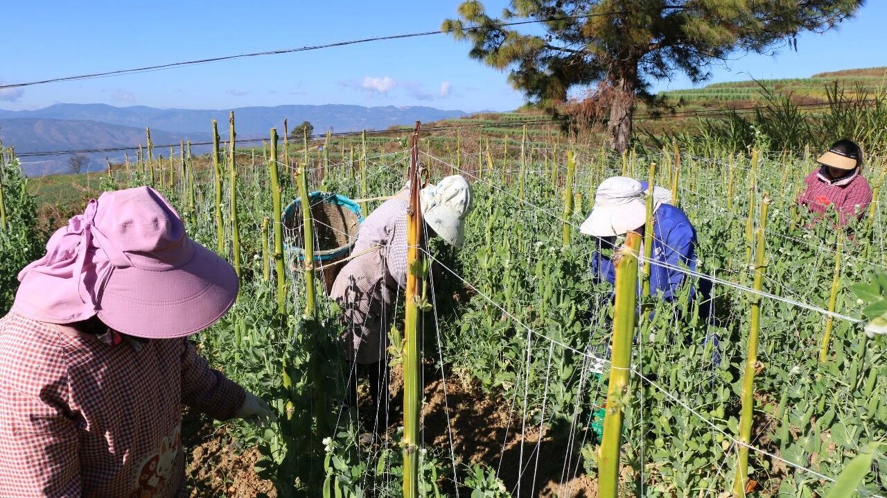 深冬时节,老麦乡老麦村黄果儿坡的300亩青豌豆田绿意盎然,藤蔓攀附在烤烟、玉米秆搭成的支架上,饱满翠绿的豆荚缀满枝头。田间地头,工人们正忙着采收,一派冬日农忙、产业兴旺的喜人景象。