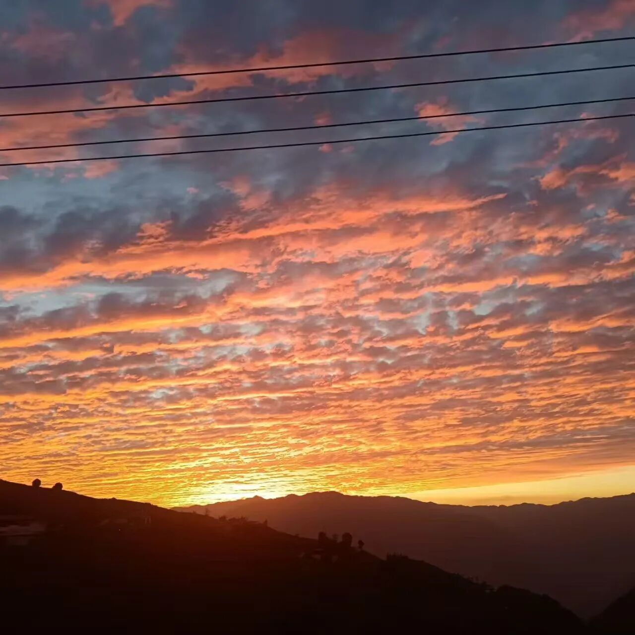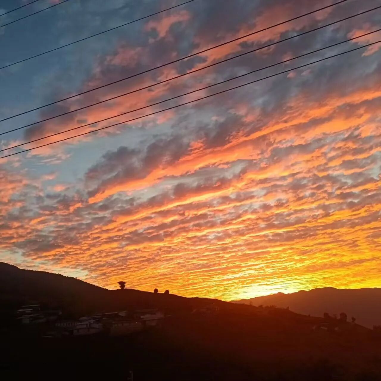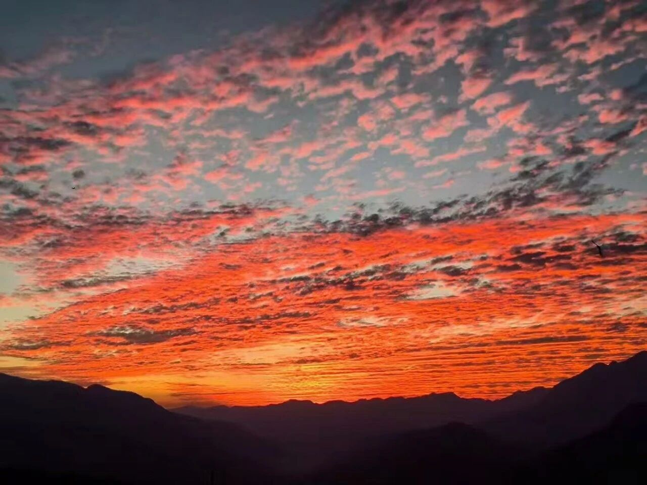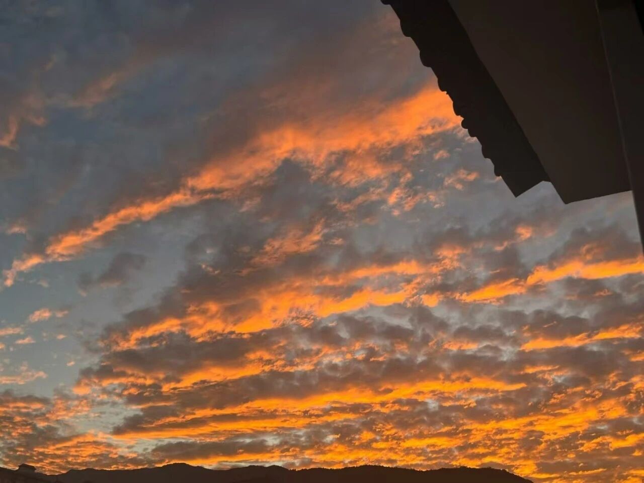 然后,在某个不经意的刹那,天空被点燃了。那抹绯红似乎获得了生命,迅速蔓延成温润的琥珀,又沸腾为流淌的熔金。银鳞般的云海转瞬化作西天一座流动的金色熔炉,景象变得庄严起来。云脊跃动着火焰,云隙倾泻着光瀑。光线从裂缝中迸射,化作支撑天穹的黄金廊柱。远山镀上辉煌的轮廓,怒江流淌成一条火红的缎带。整座小城沉浸在这光辉里,每片瓦、每扇窗都披上霞衣。色彩层层铺展:落日处是纯粹的赤金,向外渐变成富丽的橘、神秘的紫,东方天际则沉淀为月白淡青,与山影温柔相拥。一片灰蓝的云,忽然从深处迸出耀眼的光,瞬息间完成从沉寂到绚烂的蜕变。这便是天地间最温柔的挥洒,以地平线为纸,落日为笔,将整个天空写成温暖的画卷。
