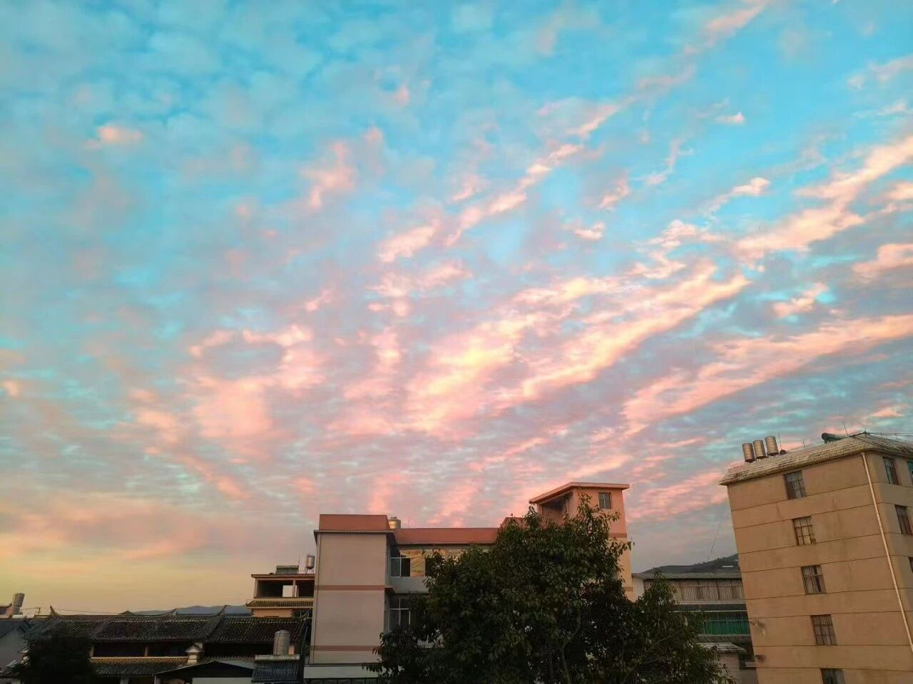 日影西斜时,天空开始了它的调色。云的边缘,悄悄染上胭脂色的羞赧,淡得像宣纸上水痕晕开的梦境。这抹颜色如此轻盈,仿佛怕惊醒了午后的静谧。巷子里响起归家的脚步声,孩童仰起脸庞,眸子里盛着银白的天光;炊烟笔直升腾,在半空散成薄纱,融入云端。人们行走在熟悉的石板路上,不曾察觉云深处,一场色彩的蜕变正悄然酝酿,像未谱完的乐章在静静地等待高潮。