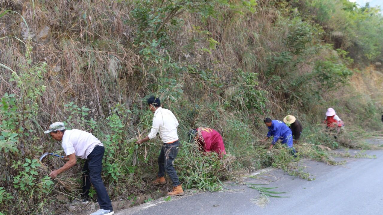 清理现场一派热火朝天的景象,全体人员热情高涨、分工协作,手持镰刀、大刀、扫把等工具全身心投入整治。操作除草机的队员高效清理道路两侧疯长的杂草,轰鸣声中杂草应声倒地;手持大刀的工作人员精准砍伐遮挡视线、影响通行的树木,保障道路视野开阔;还有人用镰刀细致割除路边残余杂草,做到不留死角;不少村民就地取材,将砍伐的树枝丫制成简易工具,快速归集杂草、枯枝并集中堆放待后续处理;保洁员们对路面残留的细碎杂草、落叶进行彻底清扫,确保路面洁净无杂物。