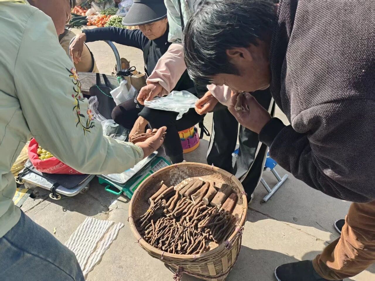 快要散场时,我又看见那个卖香胡椒根的小伙,摊上还剩最后几小把。一位阿娘正不紧不慢地挑着,阳光照在她手上,皱纹里都透着从容。