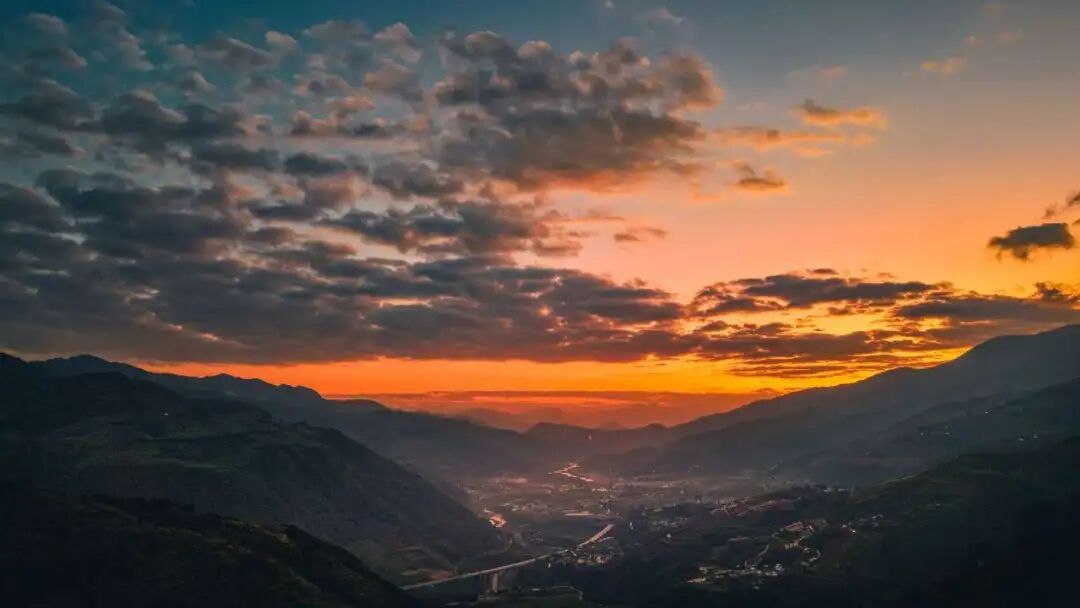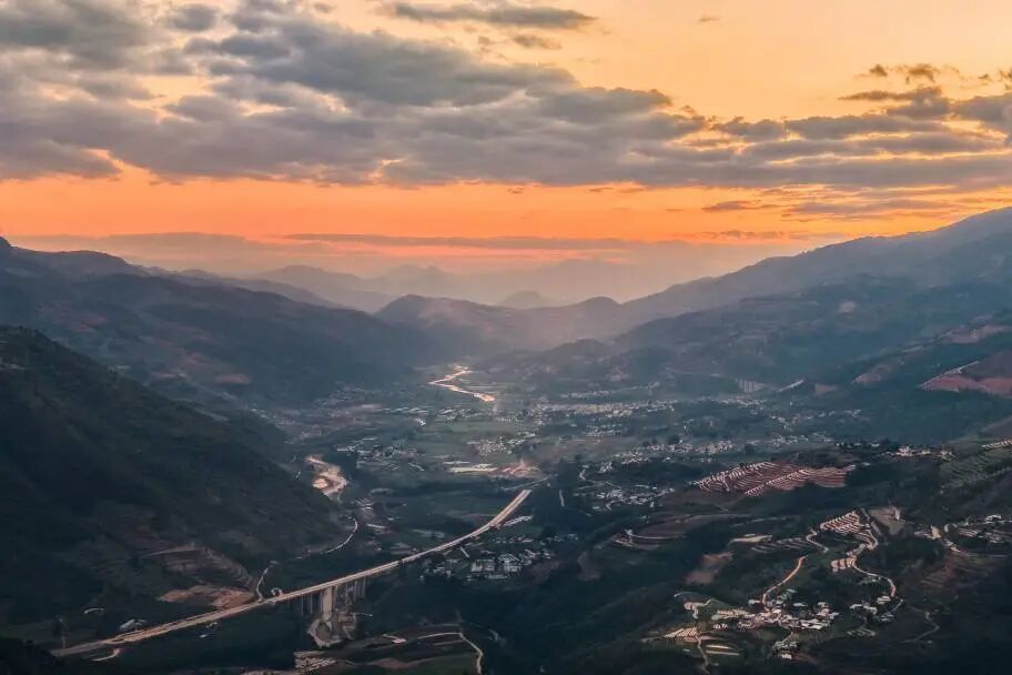 站在山巅远眺,夕阳缓缓沉入河谷尽头,为连绵山峦披上暖金色外衣。白日的灼热强光被云层温柔过滤,化作温润醇厚的蜜色橙黄,与灰蓝云絮交织,铺展成一幅层次分明的天幕长卷。勐波罗河如银链般蜿蜒穿谷,粼粼波光里倒映着漫天霞彩,随微风轻漾,勾勒出灵动和谐的自然图景。