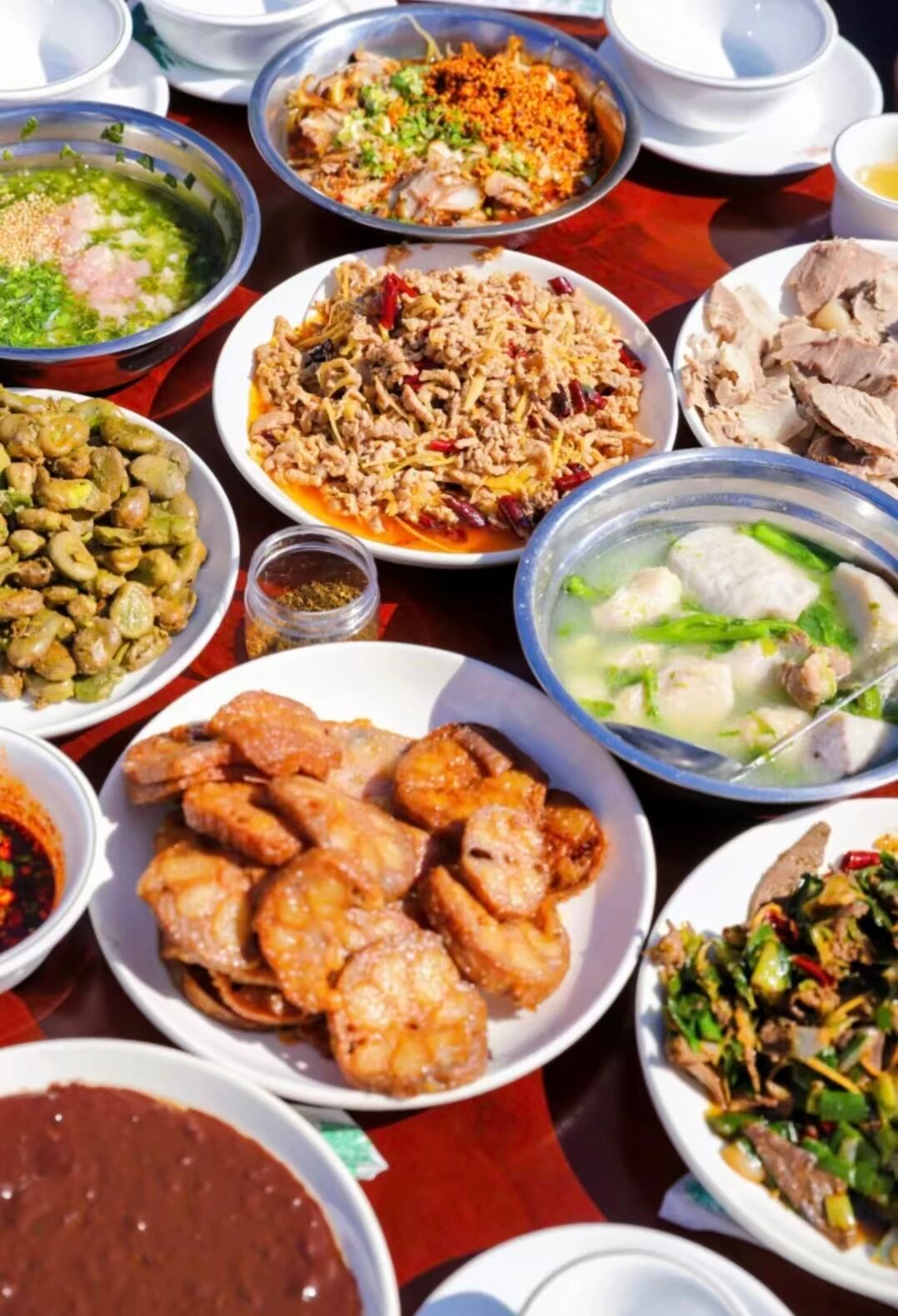 白片肉切得透亮,五花三层在阳光下泛着温润的光泽。那是用清水慢炖的功夫,肥而不腻,入口即化。蘸上油亮亮的炒猪血,香味直往鼻子里钻。火烧肉拌莴笋丝,酸辣爽口;酸木瓜小炒肉,开胃解腻;炒莲藕、炒蚕豆米,都是当下最时令的味道。