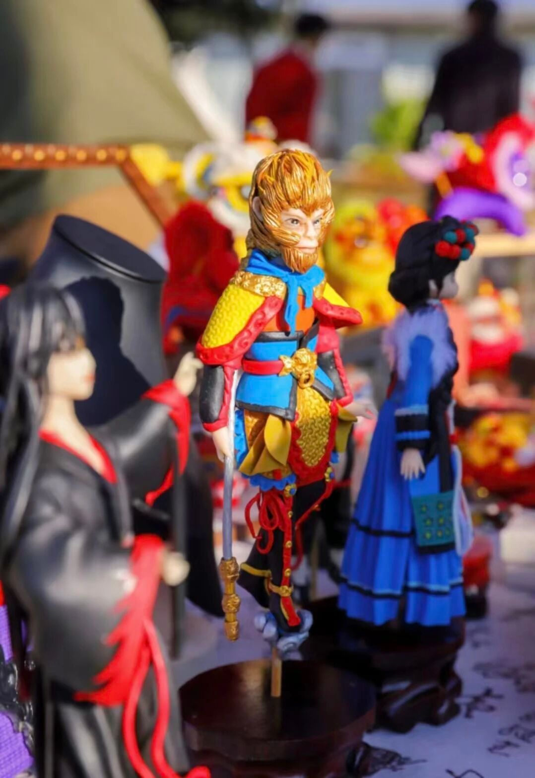 面塑摊边,最吸引人的是面塑手艺。手艺人指尖翻飞,一团彩色的面团在掌心揉、捏、刻、绘,不一会儿,一个个活灵活现的形象就跳了出来——有古典名著里的孙悟空,金箍、虎皮裙,活脱脱从书里走来;有古代仕女,眉眼含情,衣袂飘飘;有少数民族姑娘,穿戴着自己民族的盛装。