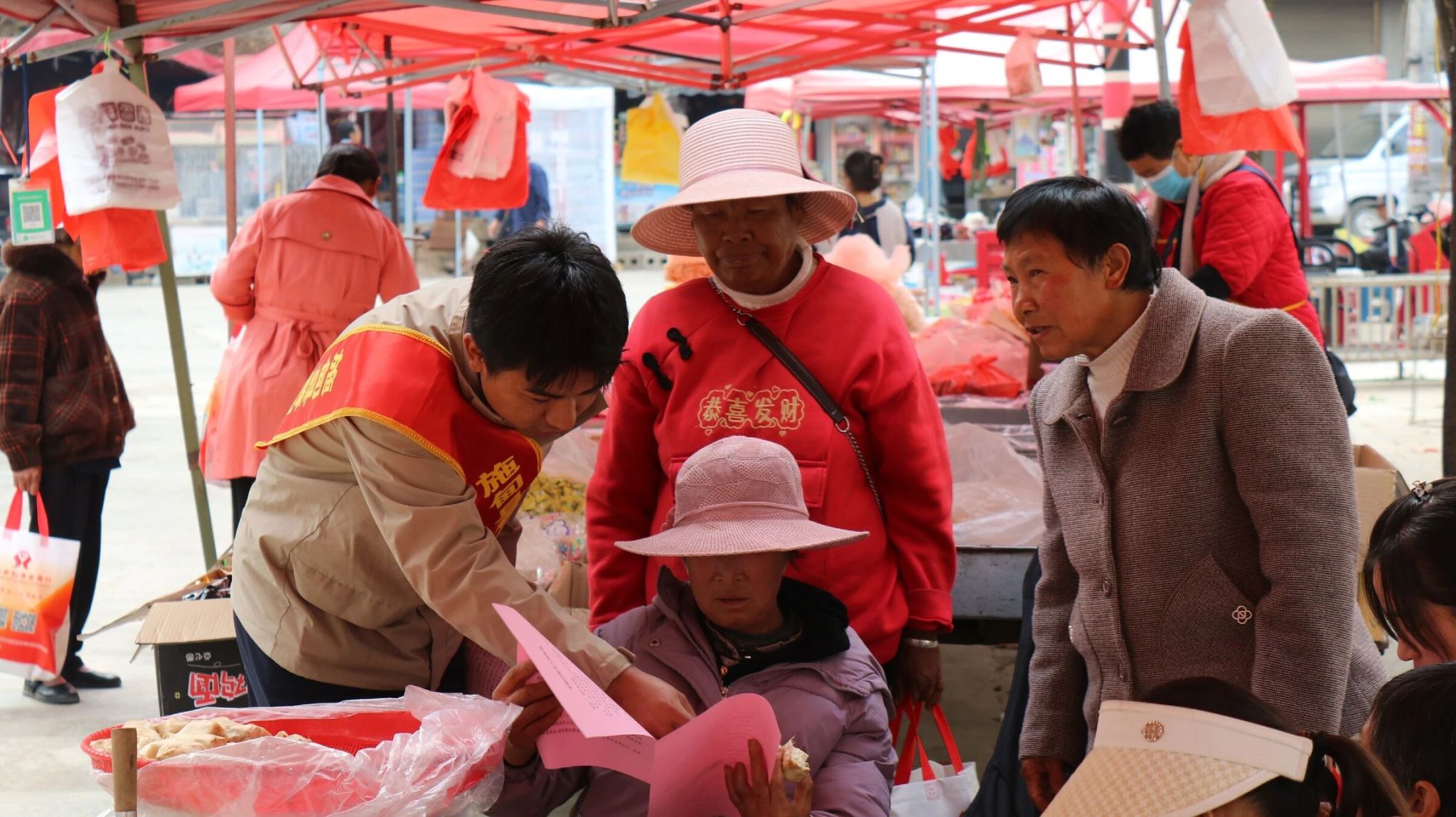活动当天,摆榔乡集市热闹非凡,宣传活动依托赶集日人流集中优势,采取“现场宣讲+网络直播”模式,构建全方位、立体化的金融知识普及阵地。
