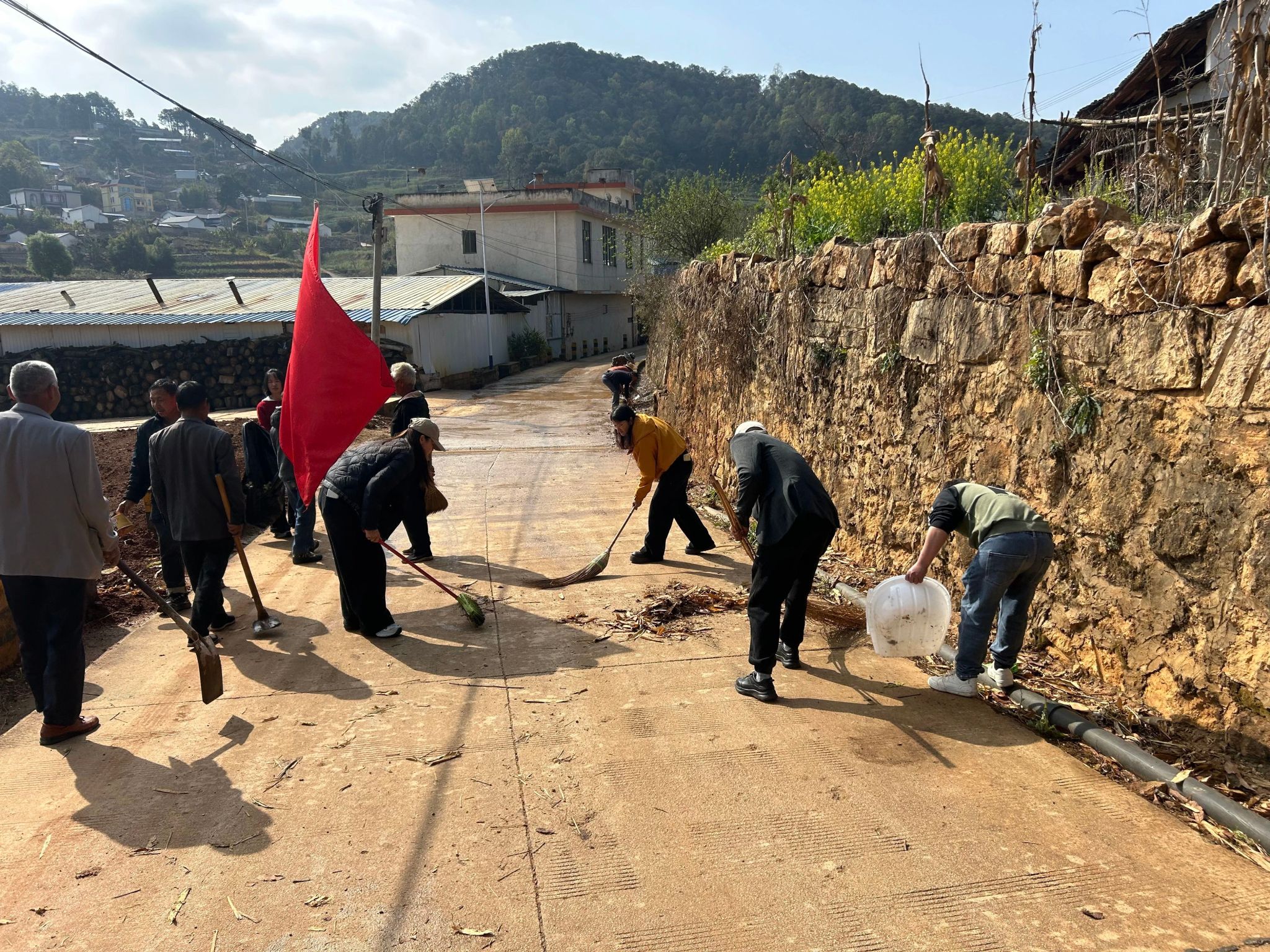 活动中,党员志愿者们统一佩戴党员徽章,主动亮明身份、分组协作,充分发扬不怕脏、不怕累的优良作风,勇当乡村环境“守护者”。大家手持扫帚、铁锹、镰刀等工具,分工明确、配合默契,对村内主干道开展全方位清扫,细致捡拾路面垃圾、杂物与枯枝落叶;聚焦沟渠排水不畅难题,对道路两侧边沟进行深度清淤疏通,彻底清理淤泥、杂草及堵塞物,保障汛期排水安全顺畅;同时对道路沿线、沟渠周边及房前屋后等卫生死角进行集中攻坚,全面铲除丛生杂草,消除环境整治盲区,做到整治无死角、清理无遗漏。