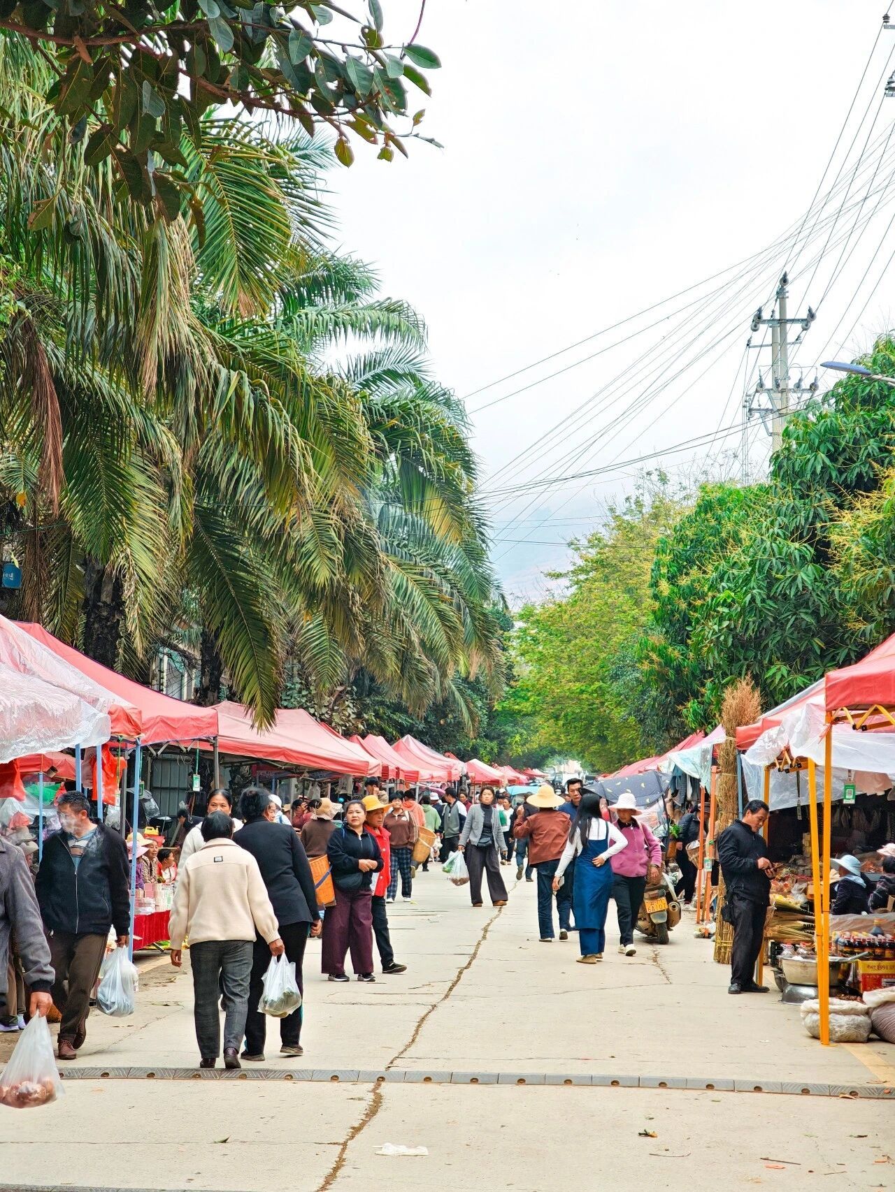 步入集市,琳琅满目的摊位依次排开,宛如一幅徐徐展开的民俗风情长卷,每一处都藏着春日的美好与乡村的质朴。蔬果区里,春的气息扑面而来,带着泥土芬芳的野菜、娇艳欲滴的野花、鲜嫩多汁的野果整齐码放,刚从田间采摘的新鲜果蔬还挂着晶莹的晨露,红的番茄、绿的青菜、紫的茄子,色彩斑斓,惹人喜爱,摊主们的吆喝声清脆响亮,“刚摘的山菜,新鲜得很,便宜卖喽”,声声入耳,满是热情。不远处的特色小吃摊前,傣族阿嬢巧手制作的苏子粑粑、泼水粑粑、灰粽、甜豆粉香气四溢,软糯香甜的味道随风飘散,引得过往行人纷纷驻足购买,一口下去,尽是家乡的味道。竹编手工艺品摊位上,青嫩的竹篾经过匠人精心编织,化作实用又美观的竹篮、竹筐、竹席、竹扇,每一件都纹理细腻、做工精巧,凝结着传统手艺人的匠心与智慧。