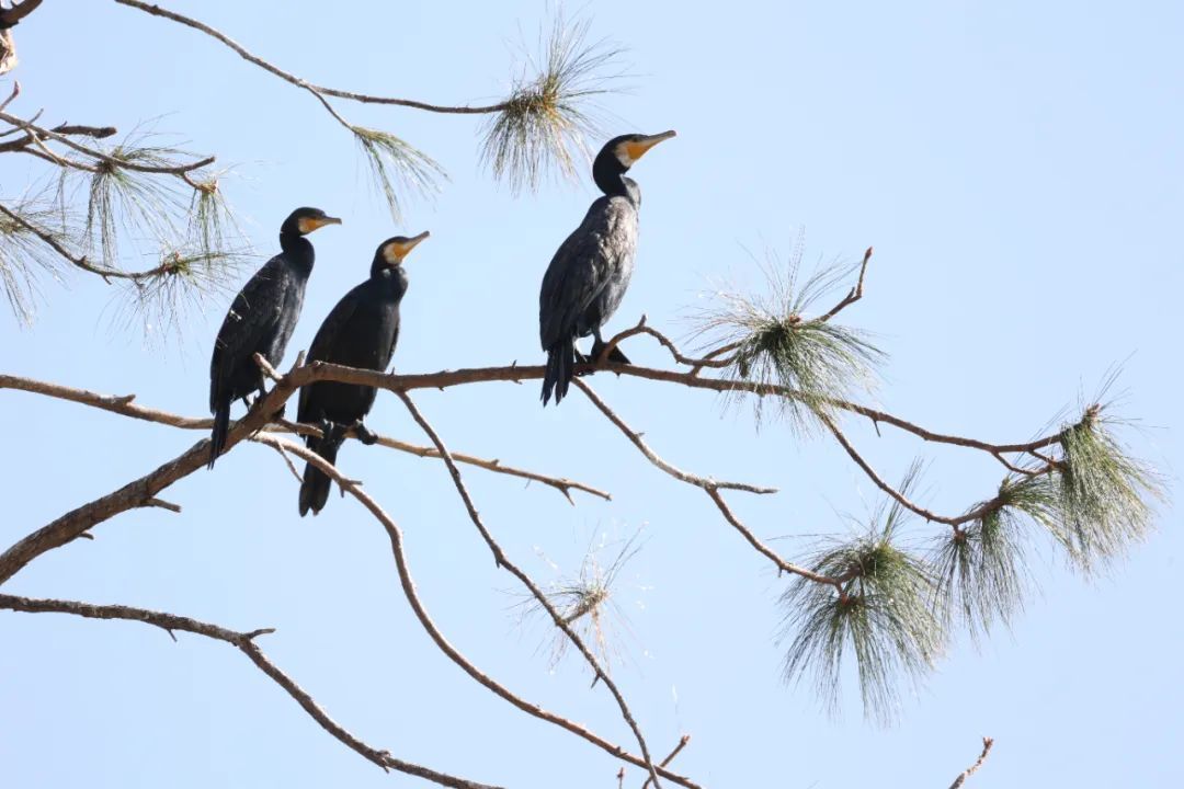 中午气温回升,候鸟们纷纷活跃起来。黑颈鸬鹚凭借出色的飞行能力,时而低空掠过水面,时而停歇于树枝。群起翱翔时,黑色翅膀在阳光下闪耀,振翅声交织成独特乐章。赤麻鸭则在水库边惬意享受阳光,时而入水嬉戏,泛起层层涟漪;时而振翅高飞,前往水库中心觅食。鱼洞水库空气清新,水面如镜,倒映着蓝天、青山、绿树与候鸟的身姿,如诗如画。