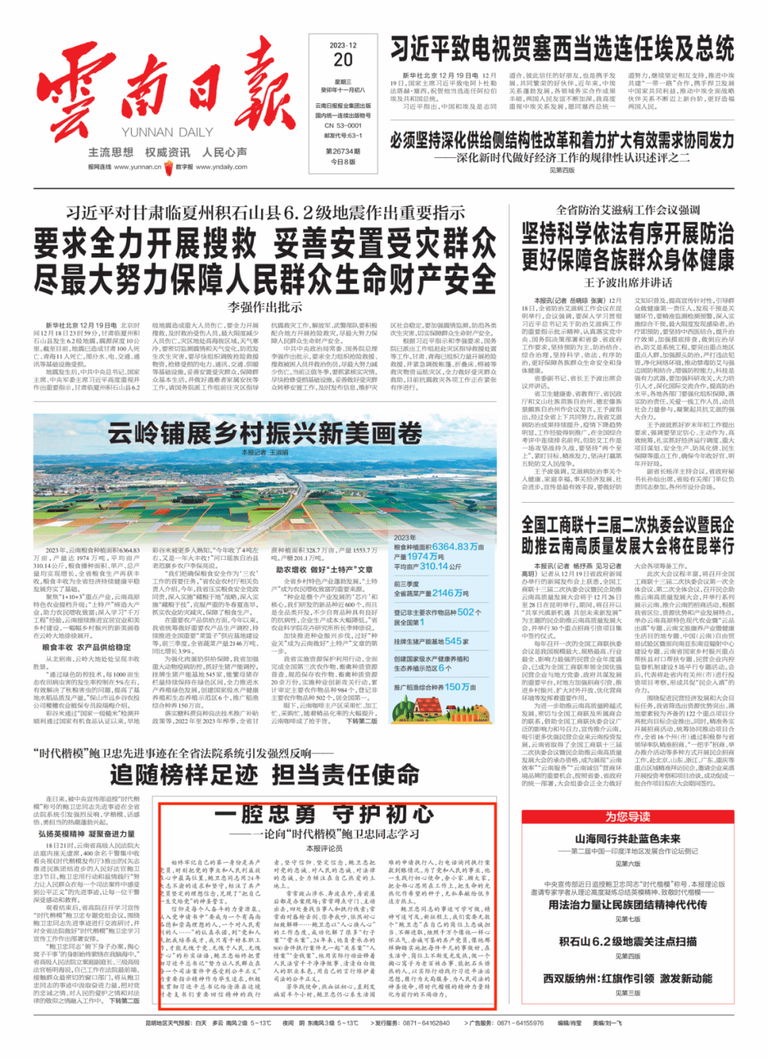 12月20日《云南日报》头版刊发评论员文章《一腔忠勇 守护初心——一论向“时代楷模”鲍卫忠同志学习》