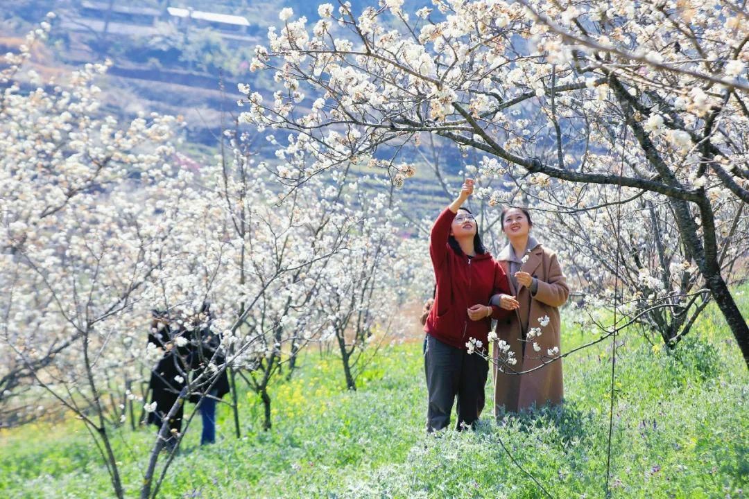 走进施甸县酒房乡的千亩樱花园,仿佛置身于一个梦幻般的白色世界,满树的白色樱花,一团团、一簇簇挂满枝头,远远望去,如云朵般可爱,也如瑞雪般圣洁。层层叠叠的花瓣在阳光下熠熠生辉,散发出淡淡花香。游客们纷纷驻足欣赏,有的拿起手机拍照,有的则静静地站在花树下,感受这难得的美景。