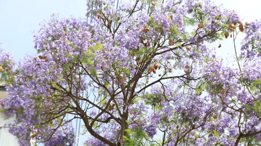 枝丫间尽是少女般的蓝花楹,她们肩并着肩、手挽着手,将整条乡村道路都织成了紫色的绸缎。风过处,千万片花瓣踮起脚尖起舞,裙裾轻扬时,连空气都跟着流转起如梦似幻的韵律。我像误入仙境的孩童,左顾右盼间,目之所及皆是惊艳,恨不能生出三头六臂,将这铺天盖地的绚丽一一收藏。