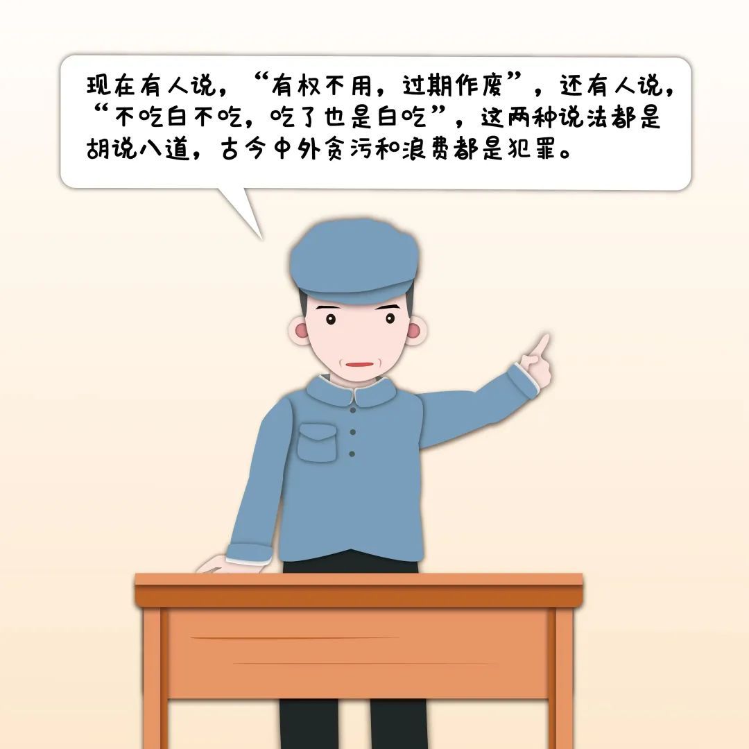 1976年年初,杨善洲在一次培训会上讲:“现在社会上有人说‘有权不用,过期作废’,还有人说‘不吃白不吃,吃了也是白吃’,这两种说法都是胡说八道,古今中外贪污和浪费都是犯罪。”