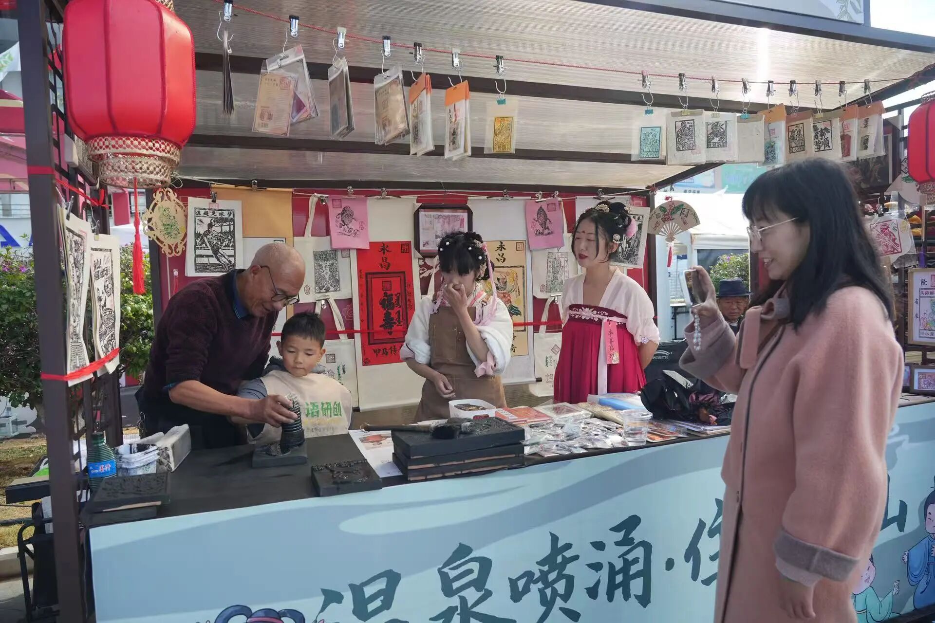 非遗展区好戏连台,文化韵味十足。赛场外,保山小粒咖啡传统制作、乌铜走银、保山永子、甲马等非遗项目集中亮相。负责展区统筹的保山汉服协会会员李建乐介绍,他们精选了13个省级非遗项目,在赛事开幕前一天就入驻,每个摊位都安排了一名协会演员装扮成猪八戒、孙悟空等角色互动助兴。甲马版画传承人李有华更是提前赶制了16块滇超主题的甲马版画,用传统技艺为保山足球队加油。