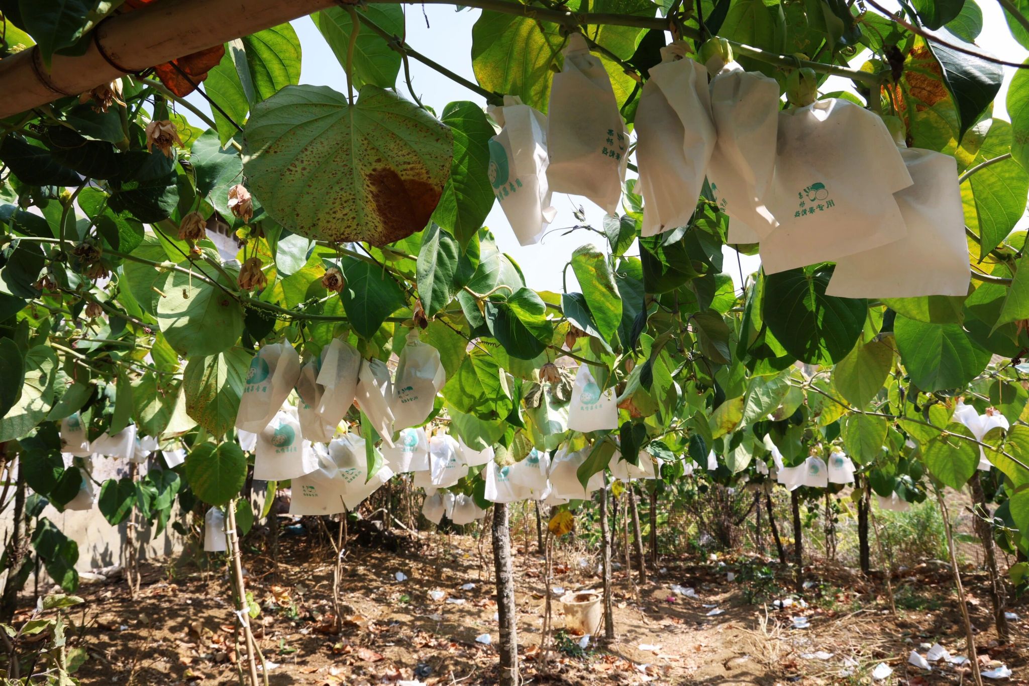 自去年6月定植以来,段开菊全身心投入果园管理,浇水、施肥、搭架、修剪等环节全程亲力亲为。经过近一年精心管护,果园迎来丰收,部分果实已成熟转色,预计3月底正式上市。“套袋既能有效防治病虫害,又能提升果实品质和售价,按目前市场价测算,150株热情果亩产值可达5000元以上。”算起增收账,段开菊脸上满是欣慰。