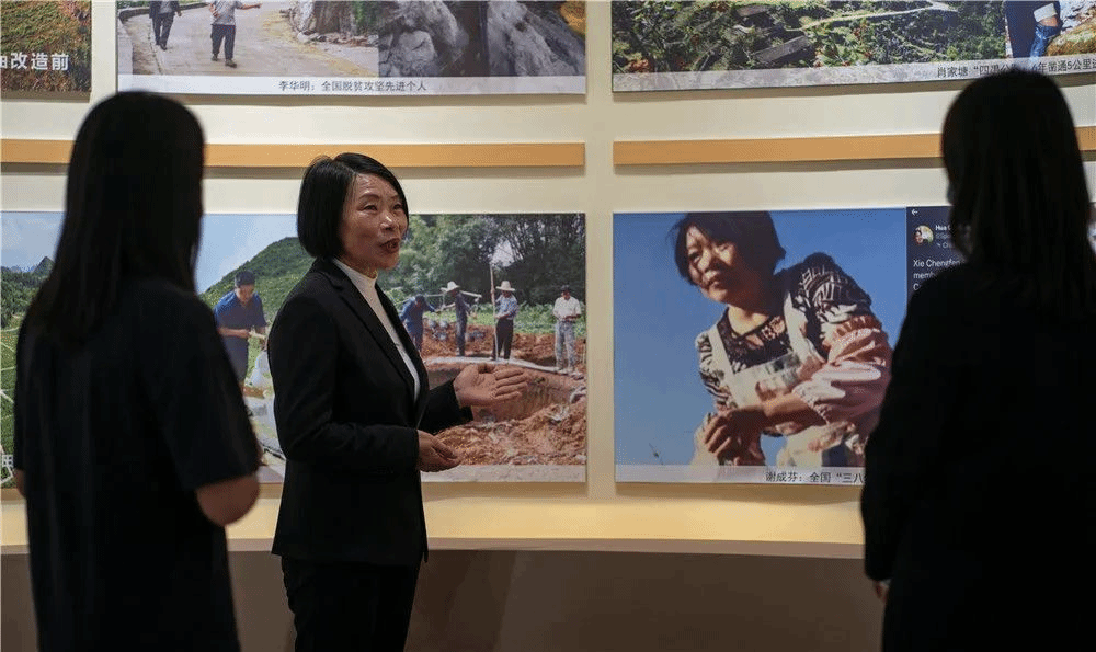 党的二十大代表谢成芬在西畴县“西畴精神”展览馆里讲述治理石漠的故事。新华社记者 江文耀 摄