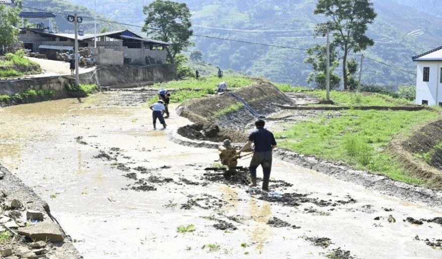 伴随着哗哗的流水声,田里水位逐渐升高,有的工人推着小型耕地机在田里不停地来回穿梭,也有的工人带着锄头帮忙打散土块、夯实田埂。现场水声、机器轰鸣声交织作响,演奏出一曲盛夏劳作乐章。