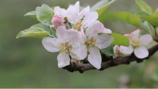素来知道桃红柳绿梨花白,而苹果花却不常见。青枝绿叶上,花骨朵呈红色或者粉红色,慢慢绽放后颜色逐渐变淡,五片花瓣团团簇拥在嫩黄的花蕊周围,花瓣微卷且舒展,颜色是由里向外、由白到粉的渐变。低头轻嗅,清冽怡人的苹果香味萦绕鼻尖,沁人心脾。白绿相间的枝条亭亭玉立,像误入了无人踏至的秘境。