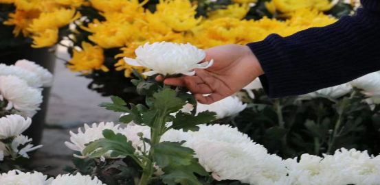 清明节期间,在由旺镇街道的临时摊位上,祭祀用的黄菊与白菊被摆放在显眼位置,销售走俏。为满足不同人群对祭祀鲜花的需求,商家还推出花束、花篮等不同包装类型。除了菊花花束,也有不少村民选择盆栽类的菊花祭奠亲人。