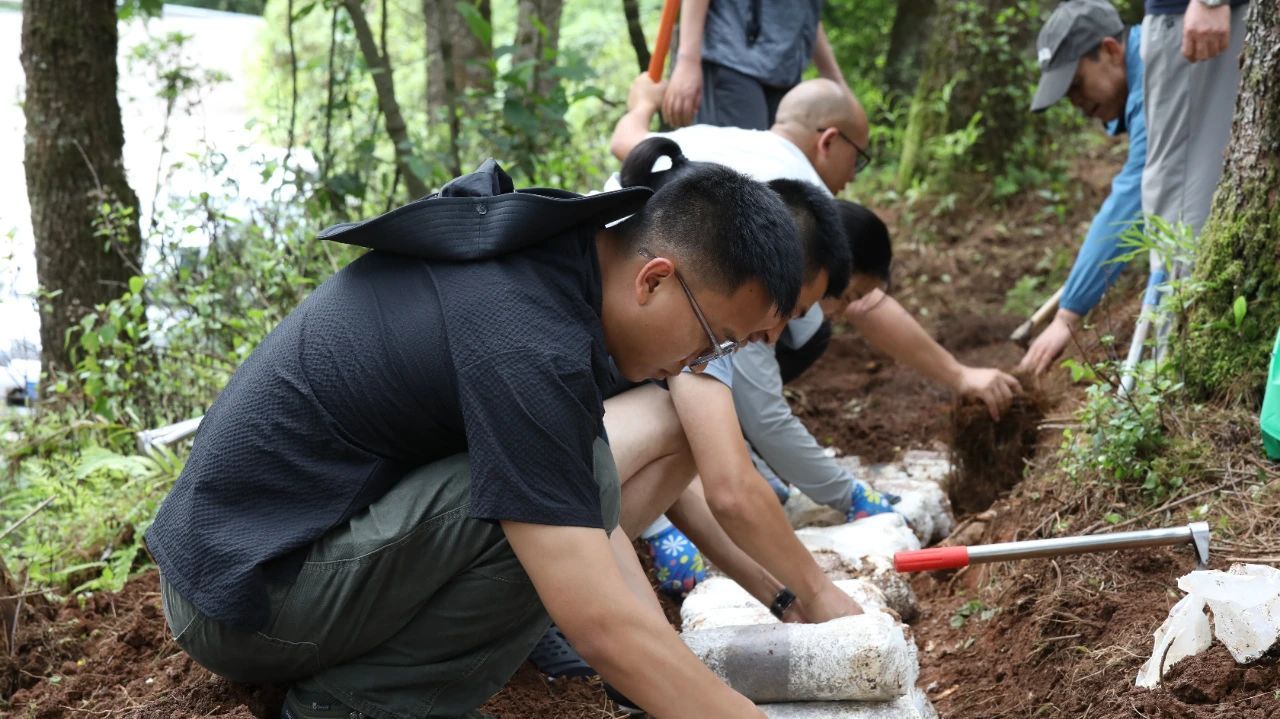 林间,党员干部身影攒动,大家用接力传送的方式将菌棒传送到林间,小心翼翼撕去菌棒的包装膜后,将菌棒整齐摆放在挖好的土坑内,用腐殖土覆盖好菌棒并用松叶平铺在上面。植树区内,挥锄声铿锵有力,搬运树苗的脚步匆匆。党员们挥汗如雨,扶正挺拔的树苗,培土踩实、提水浇灌,动作行云流水。