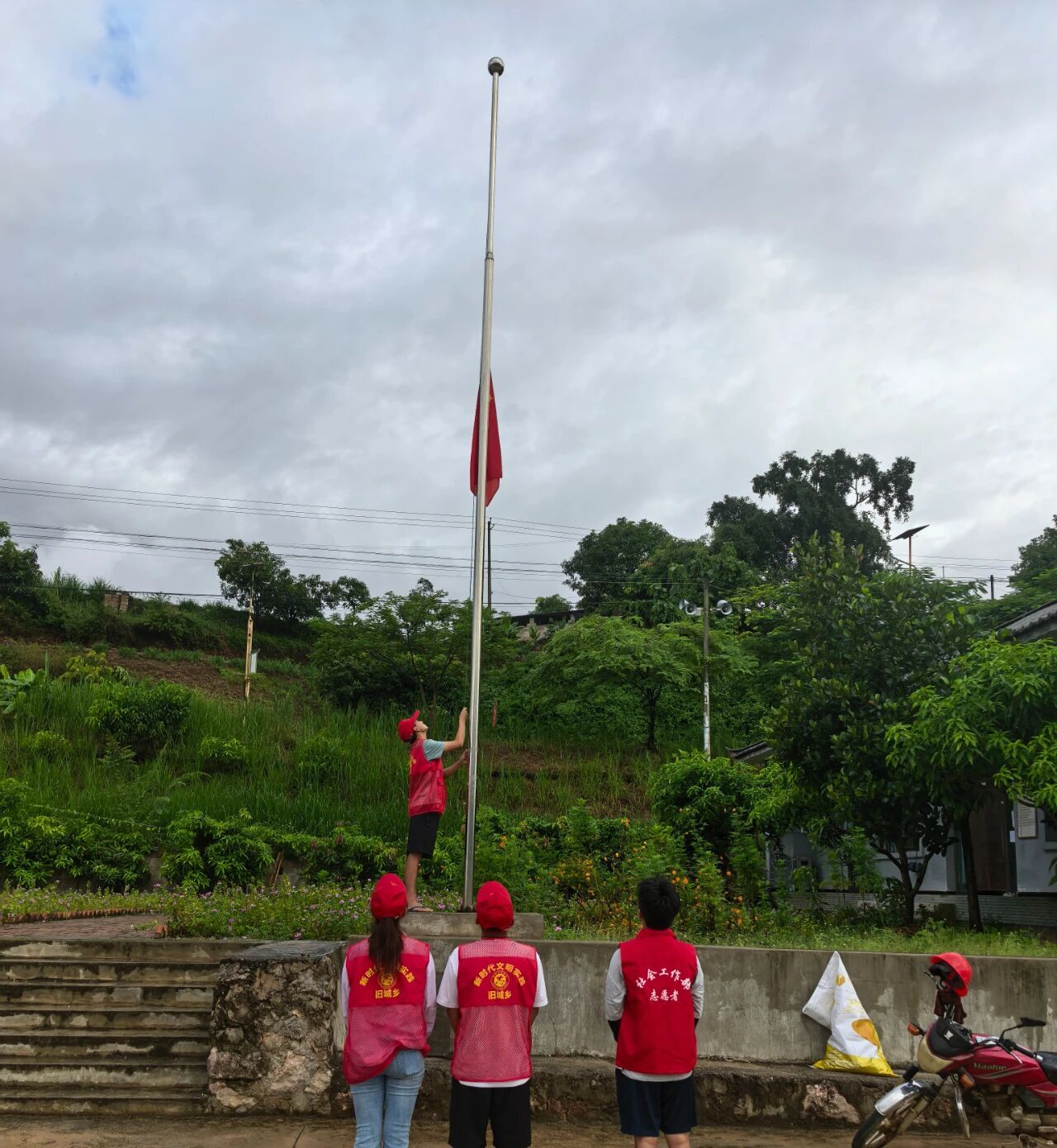 仪式现场,各村党员干部整齐列队、精神抖擞。伴随着雄壮的《义勇军进行曲》,鲜艳的五星红旗冉冉升起,全体人员神情肃穆、昂首肃立,向国旗行注目礼,目光紧紧追随着国旗升至杆顶,整个过程庄重而神圣,满含着对祖国母亲最深切的崇敬与热爱。