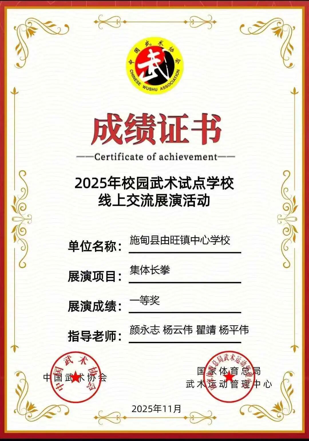 近日,2025年全国校园武术试点学校线上交流展演活动圆满落幕。施甸县由旺镇中心学校代表队凭借一套精彩的集体长拳,从全国众多参赛队伍中脱颖而出,成功斩获集体项目一等奖,为施甸县校园体育发展与文化传承写下亮眼的一笔。