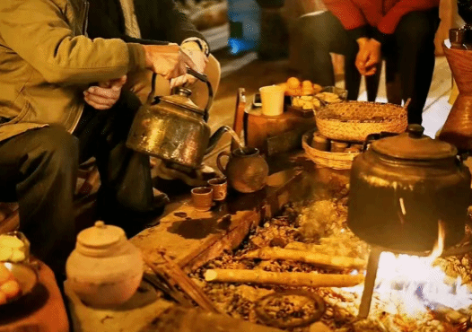 新添的柴火噼啪作响,吊在火上的陶罐里,茶水正咕嘟咕嘟地翻滚着。烤洋芋的焦香混着淡淡的松烟味,飘散在空气中。男女老少围炉而坐,火光把每个人的脸庞映得亮堂堂的。话语声、笑声和隐约哼唱的调子,让冬夜变得生动而饱满。