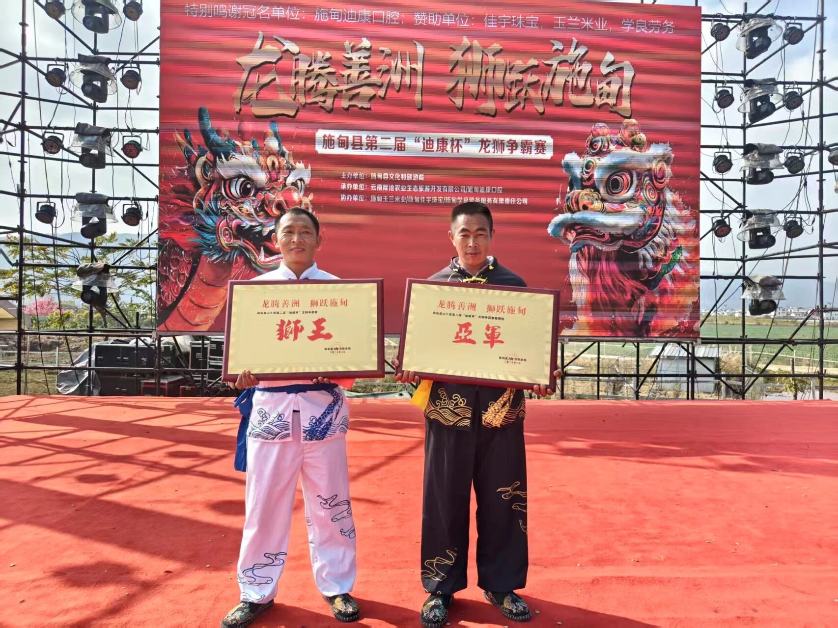 特别是在2025 年春节期间举办的施甸县第二届“迪康杯”龙狮争霸赛中,杨开强带领水长乡永保杨梅箐麻布狮子队,凭借精湛的技艺与卓越的表现,一举夺得施甸“狮王”的称号,从此声名远扬。