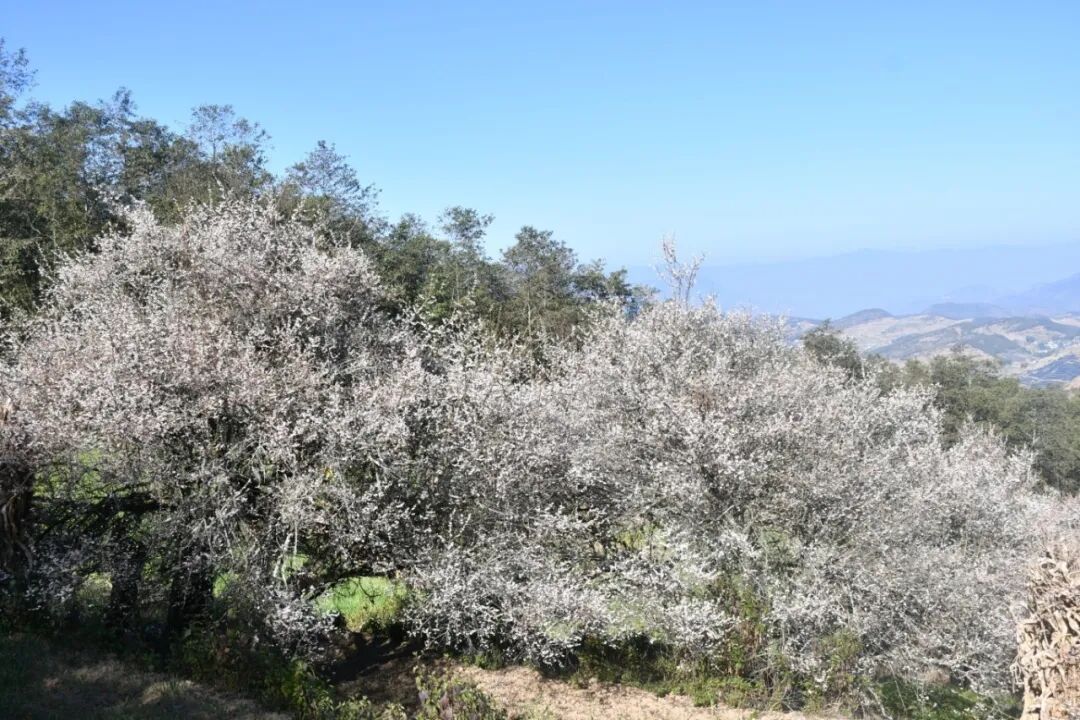 盖章山的梅花以高原野生青梅为主,种植面积超千亩,树龄多在数十年以上。不同于江南园林的雅致,这里的梅林生长在海拔2000米的山野间,老干苍劲、新花素洁,在湛蓝天空的映衬下,呈现出一种雄浑又不失柔美的独特景致。近观花瓣薄如蝉翼,边缘晕着浅粉;远望花海似雪浪翻涌,与层叠的山峦相映成趣。