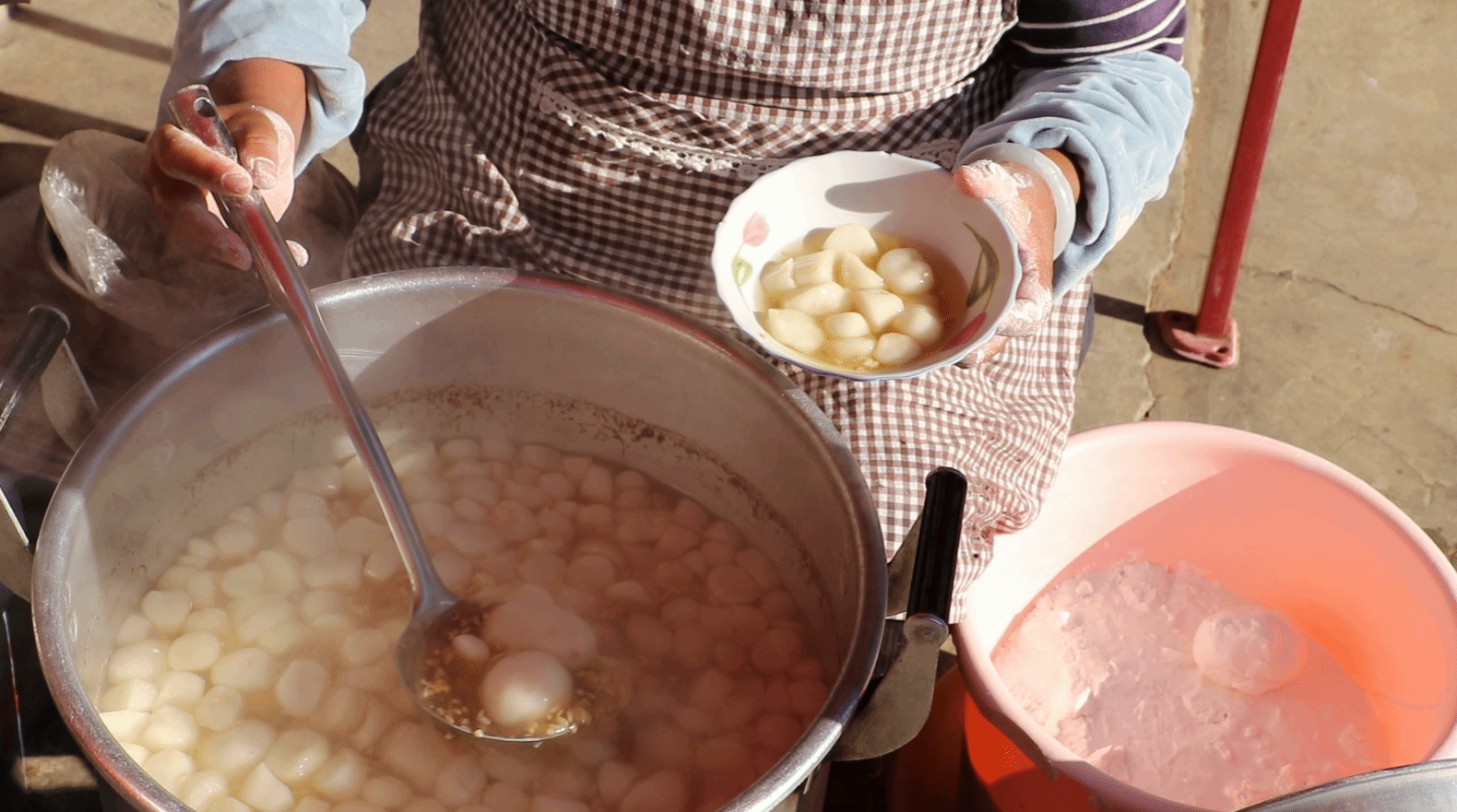 这一碗看似寻常的白酒汤圆,实则凝聚着摊主两日的心血。头一天清晨,当老街还在沉睡,上好的糯米便已被浸入清水中,静静吸收水分,慢慢苏醒。待到夕阳西下,泡得软糯适中的米粒被磨成细腻如丝的米浆,再经过去水、留存,静待次日清晨的华丽转身。第二天出摊,凝结成块的米浆被细致地分成小条,老板娘手指轻巧一揪,便是一个小面团,再一搓,就成了圆润可爱的汤圆精灵。这指尖流淌的手艺,是老街代代相传的记忆,也是机器永远无法复制的温度与情怀。