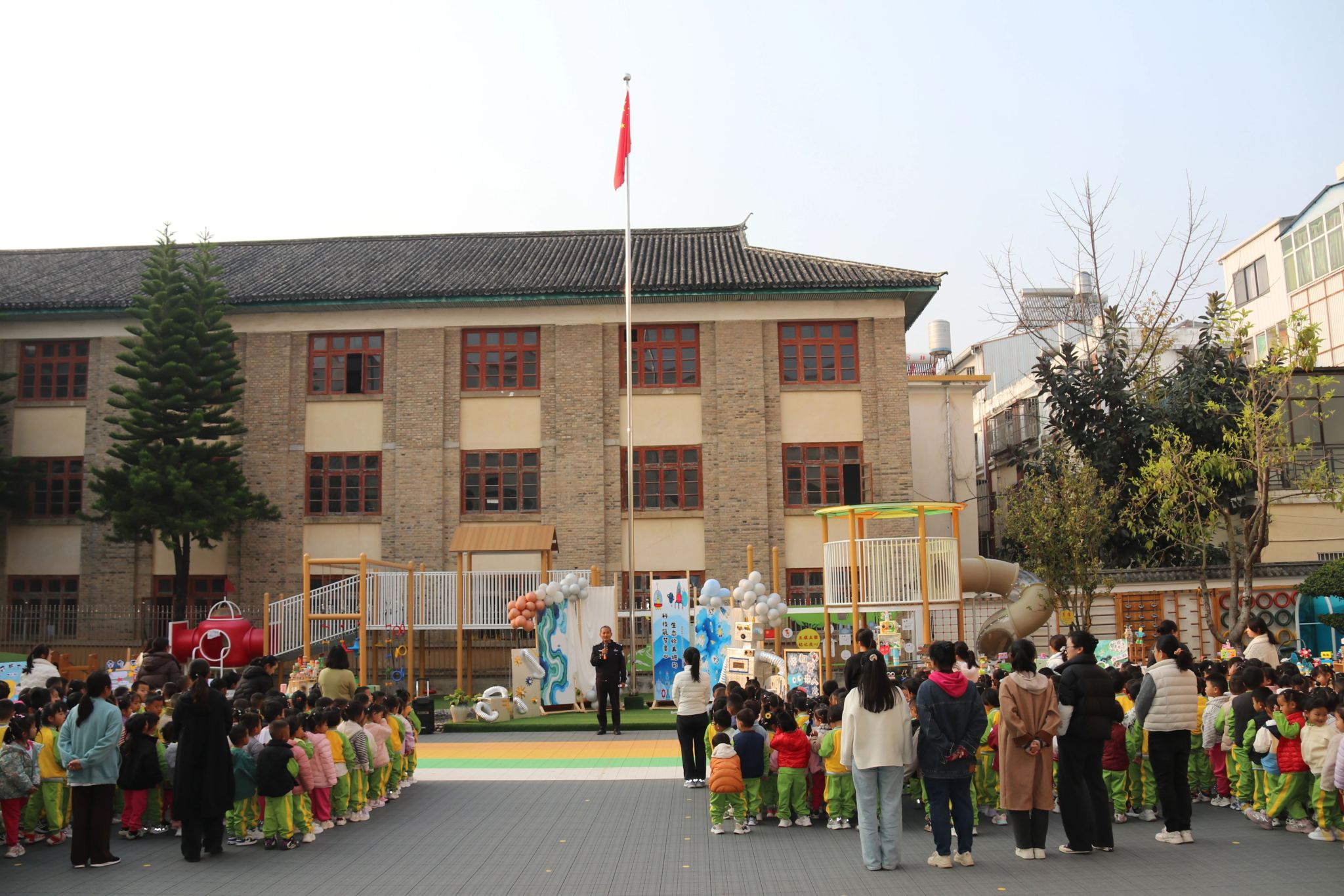 典礼在升旗仪式中启幕,法治副园长开展法治与安全宣讲,普及防溺水、防火等知识;保健副园长讲解卫生防护知识,引导幼儿养成良好卫生习惯。园长致辞寄语幼儿,鼓励幼儿争做科学探险家、环保小卫士与家乡代言人。