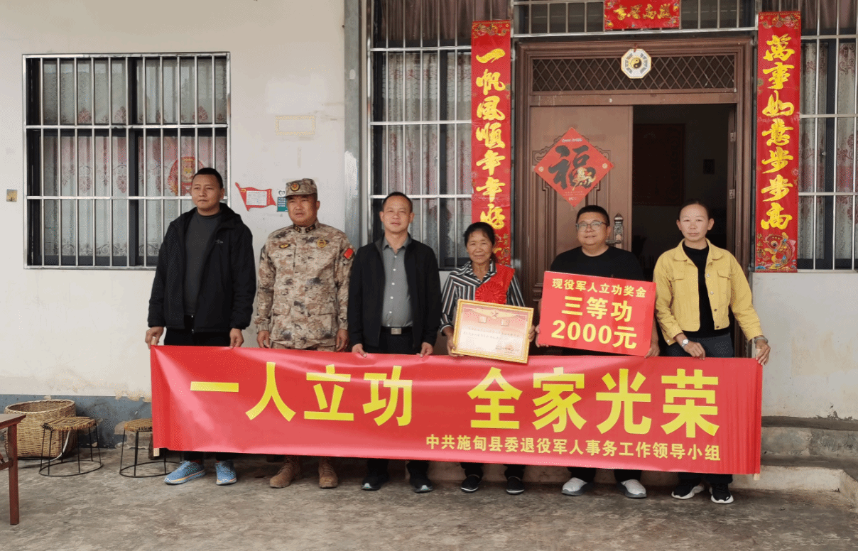 近日,何元乡退役军人事务部门联合乡武装部、乡退役军人服务站,组建由乡、村两级工作人员组成的立功送达小组,深入何元乡莽王村,为该村荣获三等功的现役军人段海钦家庭送达立功喜报与奖金,将党和政府对军人军属的尊崇与关怀精准送到群众心坎上。