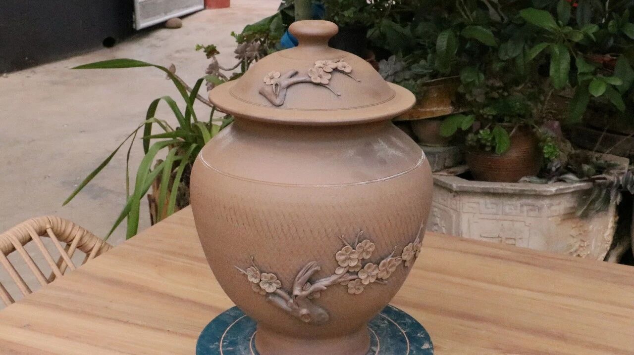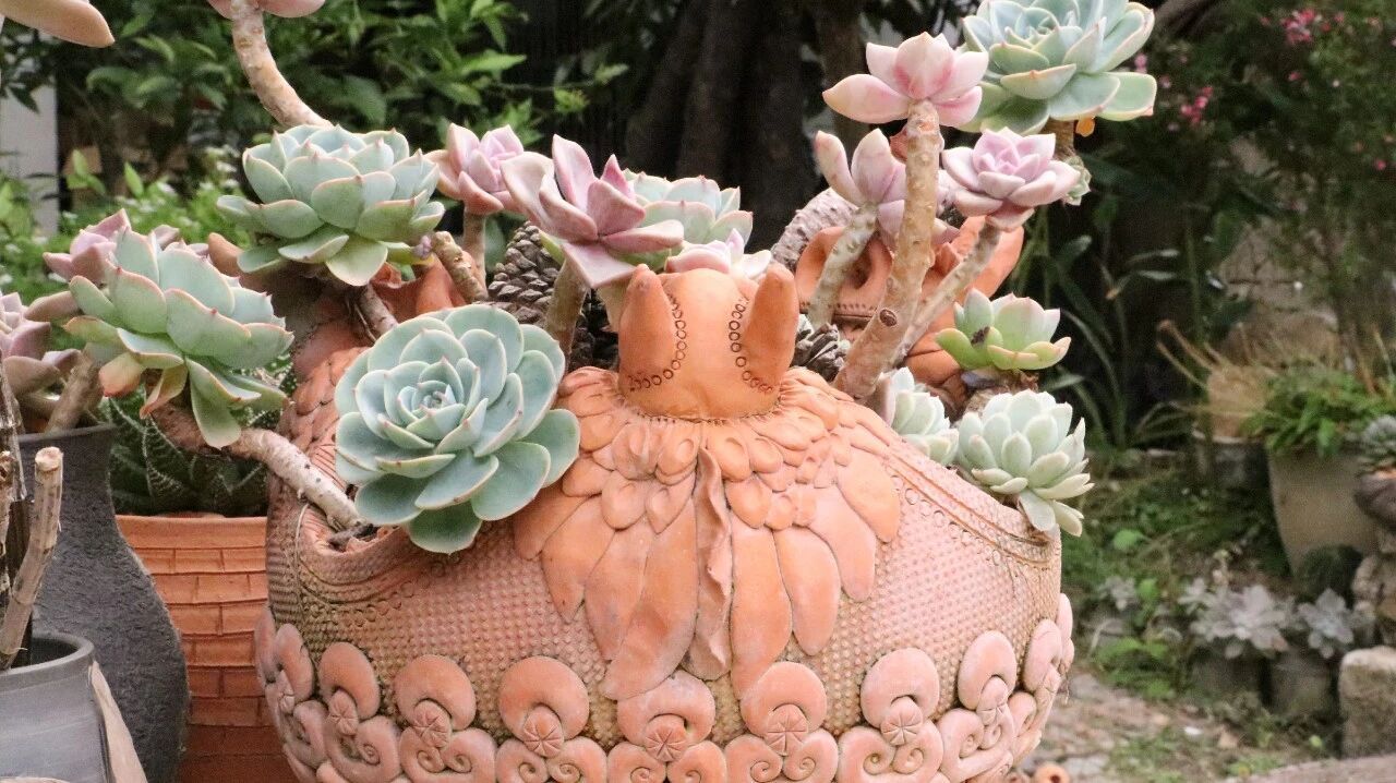 小院不大,却被主人收拾得错落有致,处处藏着陶艺的浪漫。墙角整齐堆着几摞待烧的泥坯,青石板上晾着刚塑好形状的陶罐,院中两棵老树舒展枝叶,洒下满满一院阴凉。树枝上用麻绳轻轻挂着几个质朴的陶艺花瓶,树下造型憨态可掬的陶艺花盆错落摆放,盆里的多肉蓬勃生长,与满院的陶土气息相映成趣。夫妻二人就在这方治愈的小天地里,日复一日,将一堆堆温润的建水紫泥,精心雕琢成一件件饱含心意的陶艺器物。