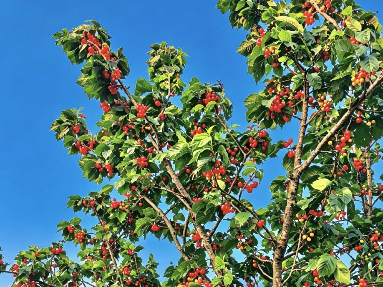 林间满是热闹的采摘氛围,游客们提着提篮穿梭在树间,轻手采摘带着阳光温度的樱桃;孩童们举着刚摘下的红果,眉眼间满是欢喜,欢声笑语回荡在果园。枝头成簇的红果、叶隙间洒落的光斑,与游客的笑容相映,构成一幅鲜活生动的田园丰收画卷,随手定格便是满屏红绿交织的春日浪漫。