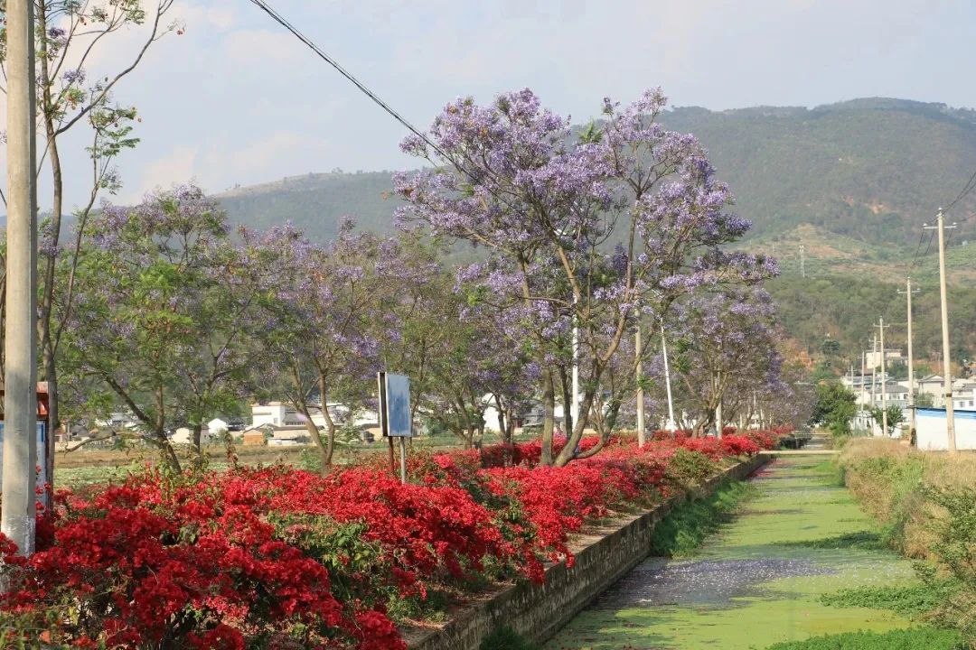 枝丫间尽是少女般的蓝花楹,她们肩并着肩、手挽着手,将整条乡村道路都织成了紫色的绸缎。风过处,千万片花瓣踮起脚尖起舞,裙裾轻扬时,连空气都跟着流转起如梦似幻的韵律。我像误入仙境的孩童,左顾右盼间,目之所及皆是惊艳,恨不能生出三头六臂,将这铺天盖地的绚丽一一收藏。